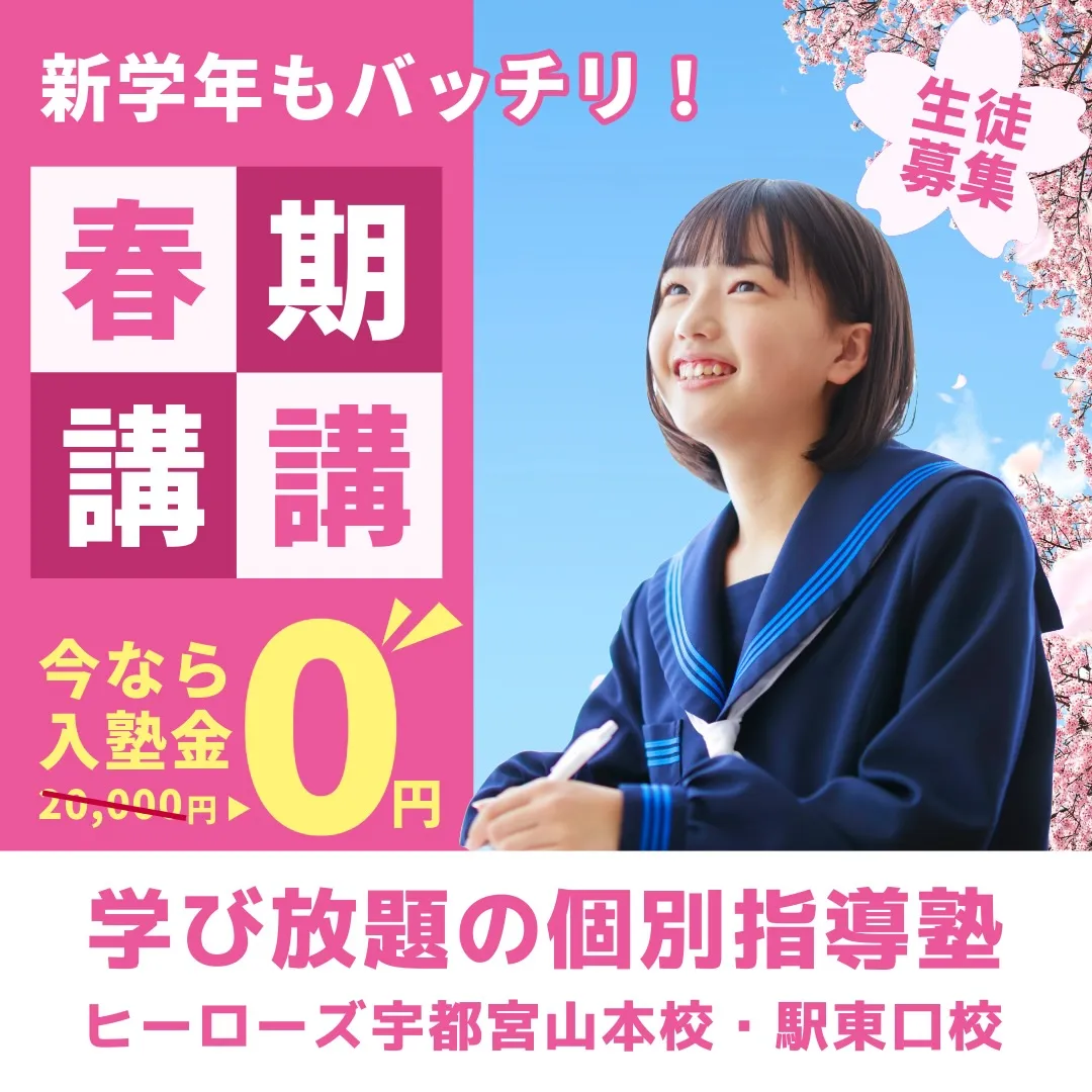 ヒーローズではただいま春期講習を実施中です。これまで学んだことの復習はもちろん、新学期に備えて予習も大切です。学び放題コースを利用すれば、何コマでも追加料金なしで受講できますよ。新学期は最高のスタートを切って、テストで自己ベストを狙ってみましょう。しっかり準備して、充実した新学期を迎えてくださいね!