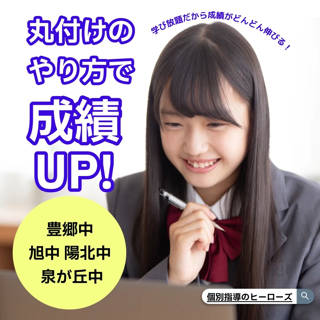 豊郷中、旭中、泉が丘中、陽北中の生徒の皆さん、こんにちは。皆さんの数学や理科の成績を上げるための、正しい丸付けの方法を知ってますか? 間違えた問題の解答を、ノートにきれいに書き写して満足しているかもしれませんが、それでは成績は伸びません。間違えた問題にはしっかりとバツをつけ、解き方を確認して理解することが大切です。そして、もう一度同じ問題を解くことで、確実に成績が上がっていきます。